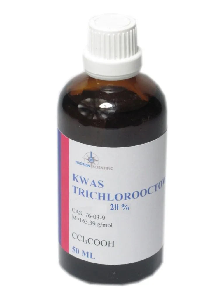 Roztwór 20% jest rozcieńczony — bezpieczniejszy w użyciu. Stężony TCA (100%) to kryształy, wymagające ostrożności. Ten roztwór nadaje się do delikatniejszych prac. Nie wymaga specjalnych warunków magazynowania jak forma stała.